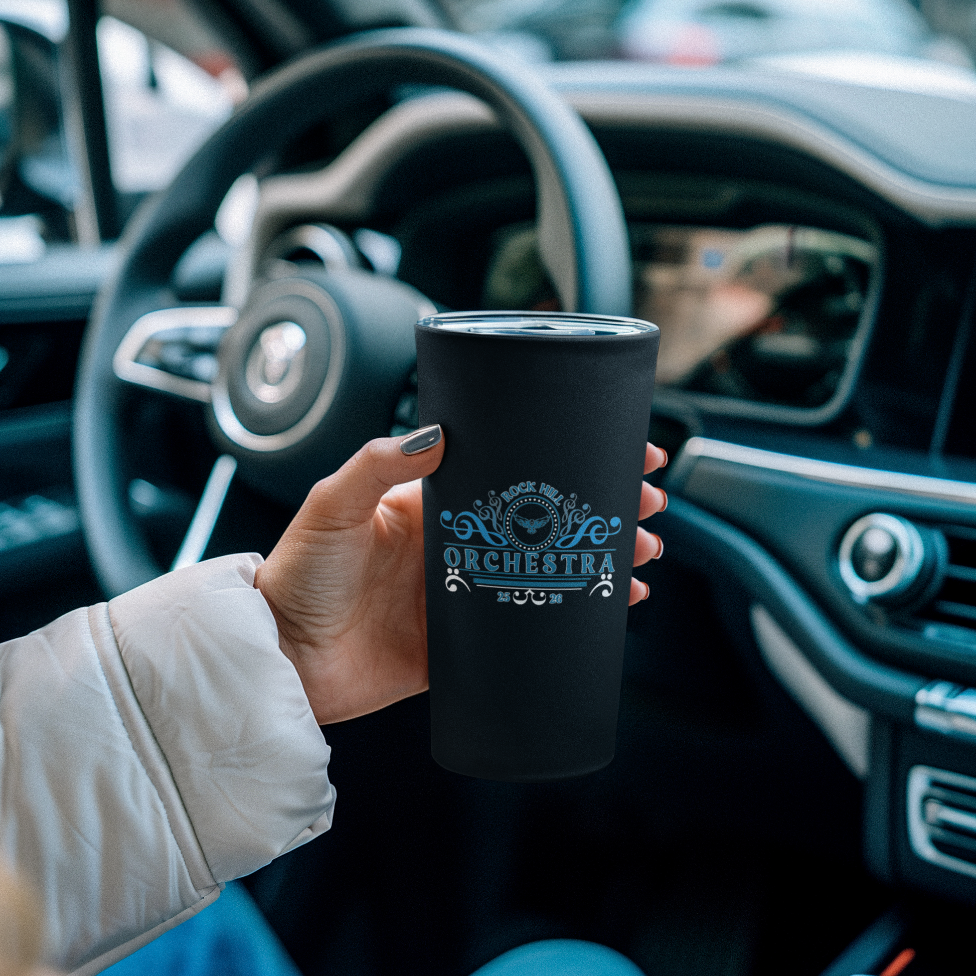 Available in Blue and White, each tumbler includes your choice of official 2025–2026 Rock Hill Orchestra designs.